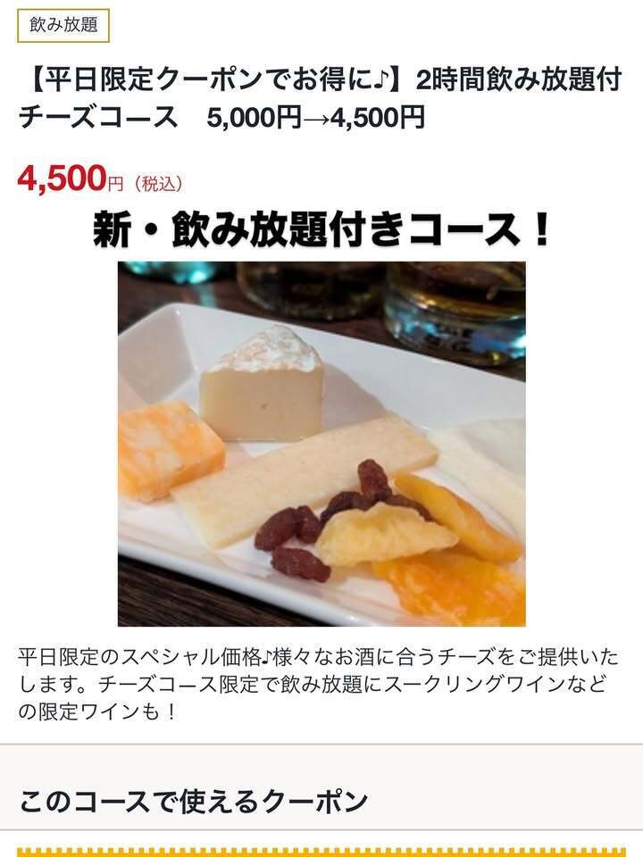 チーズを中心とした料理と、いつもの飲み放題にワイン赤白それぞれ2種類と、スパークリングワインも飲み放題がついた、夏のお得なコース❗️